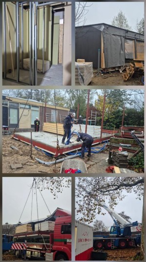 Een secuur werkje! Maar het ging snel en voorspoedig. Op vrijdag 14- en zaterdag 15 november zijn ze druk bezig geweest met de vloer, het dak en de zijwanden. En dan ineens zie je hoe groot dit gebouw eigenlijk is. Een grote nieuwe groepsruimte met 2 slaapkamers, berging, verschoonruimte en een keuken. We moesten nog wel even een oplossing zoeken voor de deur naar de centrale entree. Want die zat ‘ineens’ heel ergens anders dan de bedoeling was. Maar, met een beetje stress en puzzelen zijn we daar ook uitgekomen! Het vraagt nu vooral nog veel afwerking!